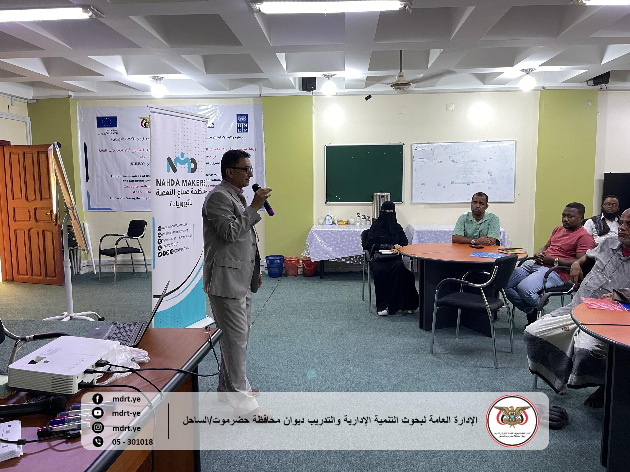 دشن وكيل محافظة حضرموت الأستاذ حسن سالم الجيلاني ومعه المدير العام للإدارة العامة لبحوث التنمية الإدارية والتدريب بساحل حضرموت الدكتورة مارينا عوض الجوهي صباح اليوم دورة تدريبية حول السكرتارية وإدارة المكاتب والأرشفة وإعداد المراسلات الإدارية وتأتي هذه الدورة برعاية كريمة من محافظ حضرموت الأستاذ مبخوت مبارك بن ماضي وتمويل مكتب وزارة النقل ومكتب وزارة الثقافة وصندوق النظافة والتحسين بساحل حضرموت وتنفيذ وتنسيق وإشراف الإدارة العامة لبحوث التنمية الإدارية والتدريب بساحل حضرموت.
